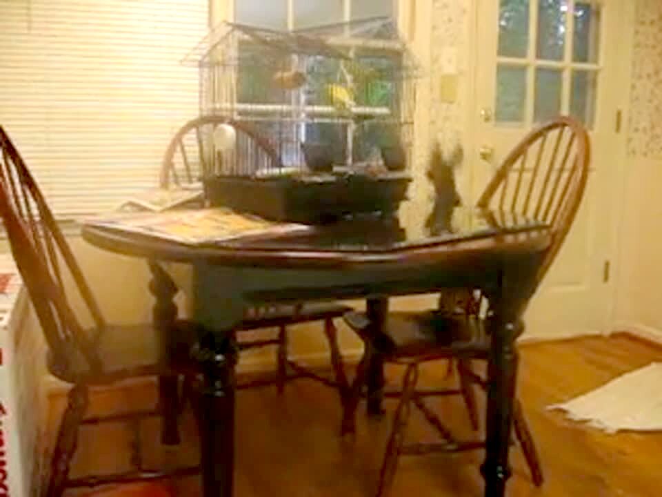 Doberman dog jumps up over & over to see pet birds in cage on dining room table.