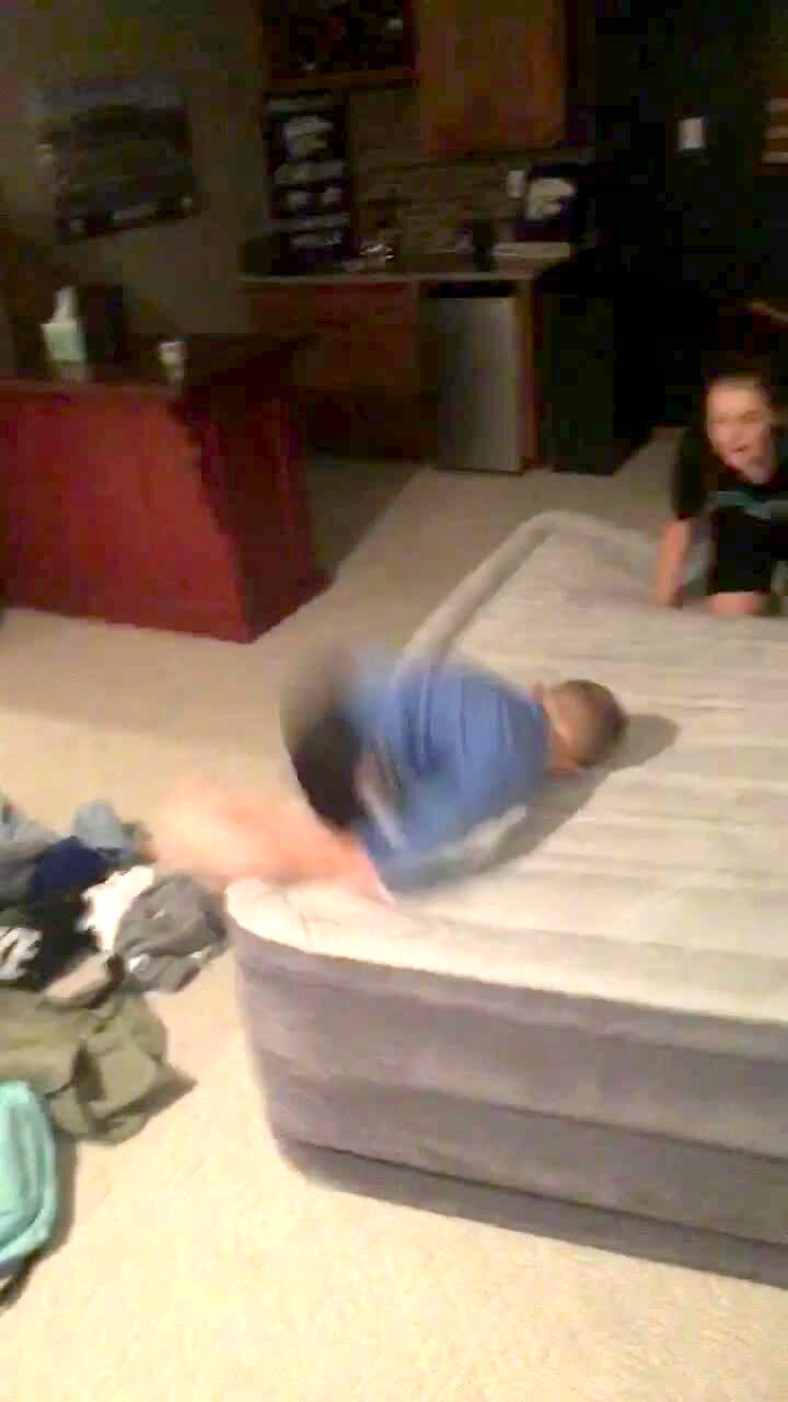 A young boy jumps from a couch onto a mattress and does a front flip then hits the edge and falls on his shoulders and side.