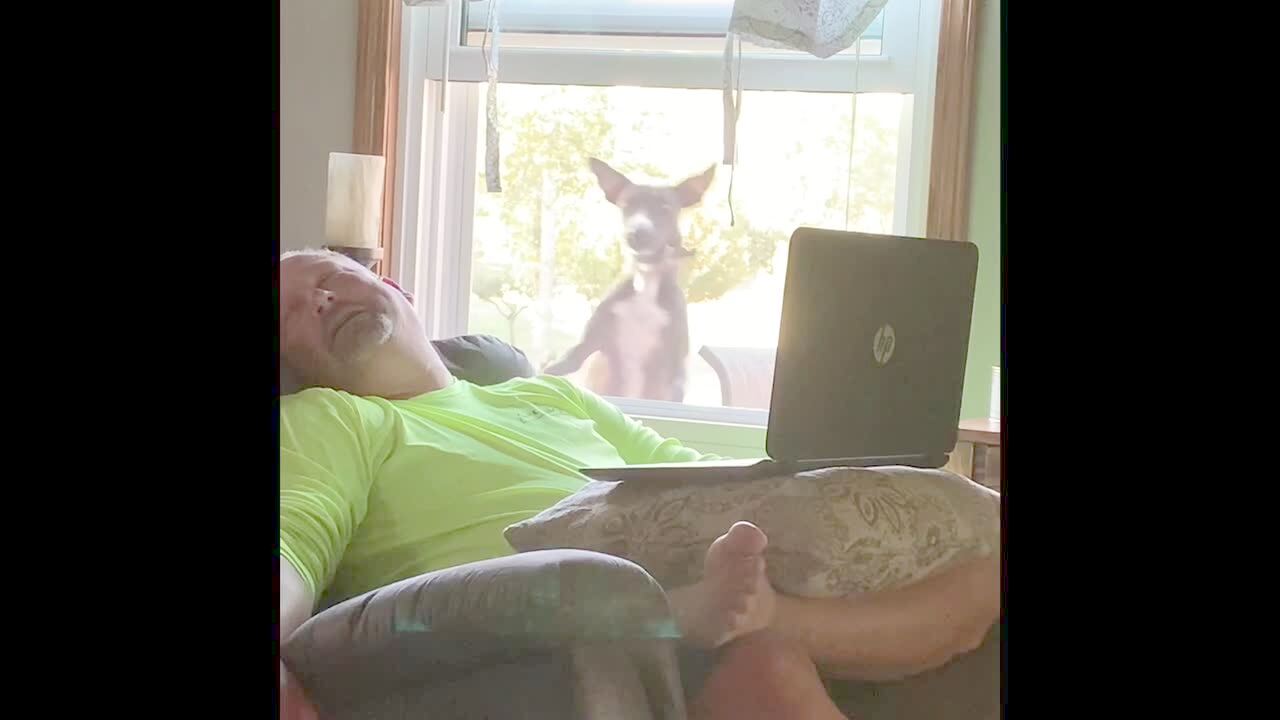 Teen boy jumps through a window screen on purpose and lands in the yard.