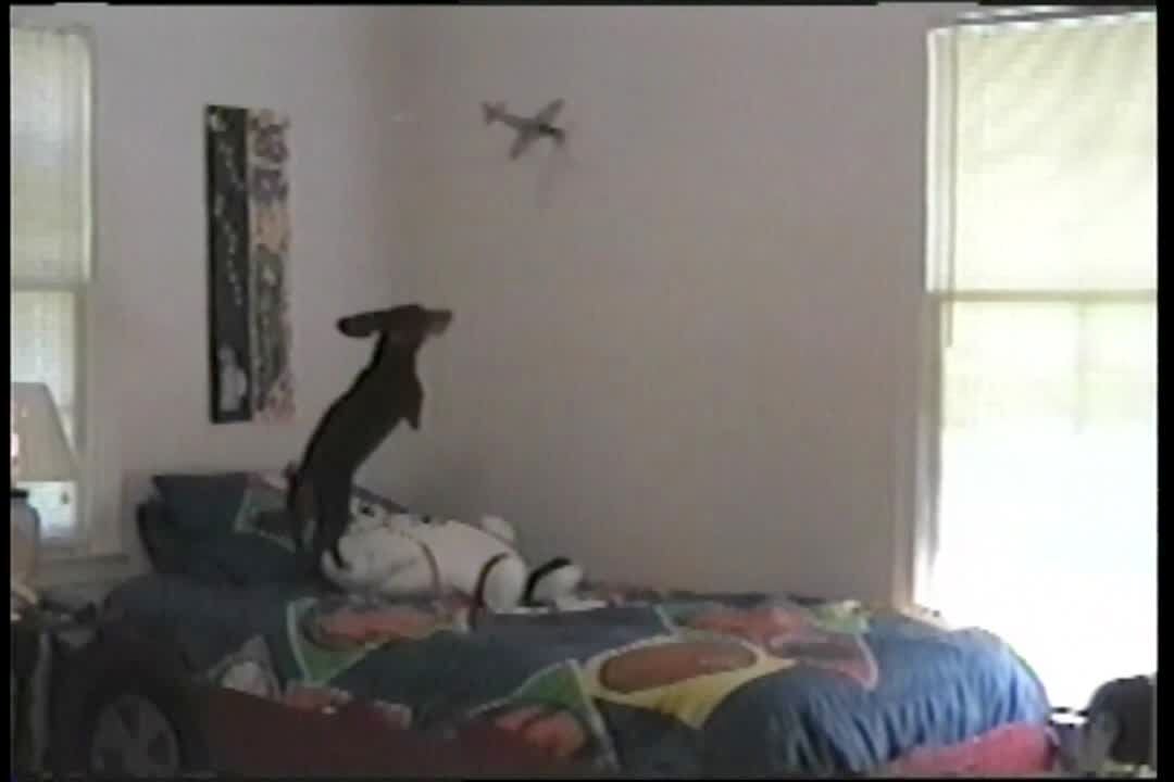 Small dog jumps repeatedly, you can only see the dog's head as she jumps above the bed.