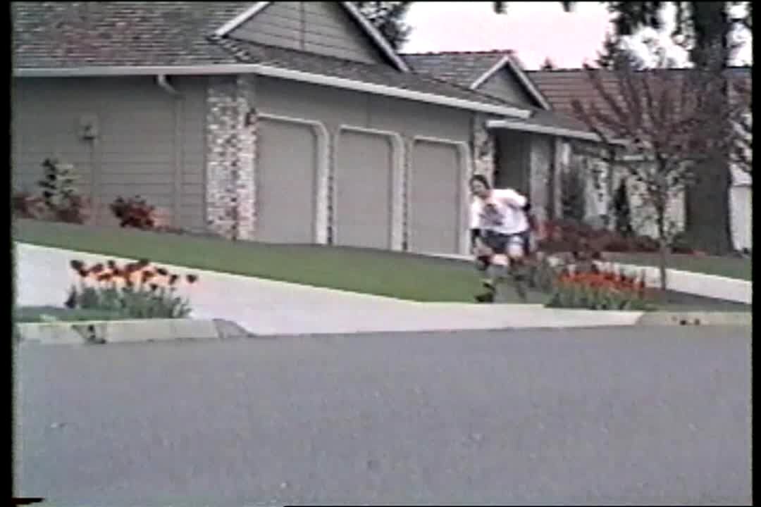 Teen boy riding a skateboard does a trick in the driveway, the board flips up and hits him in the groin.