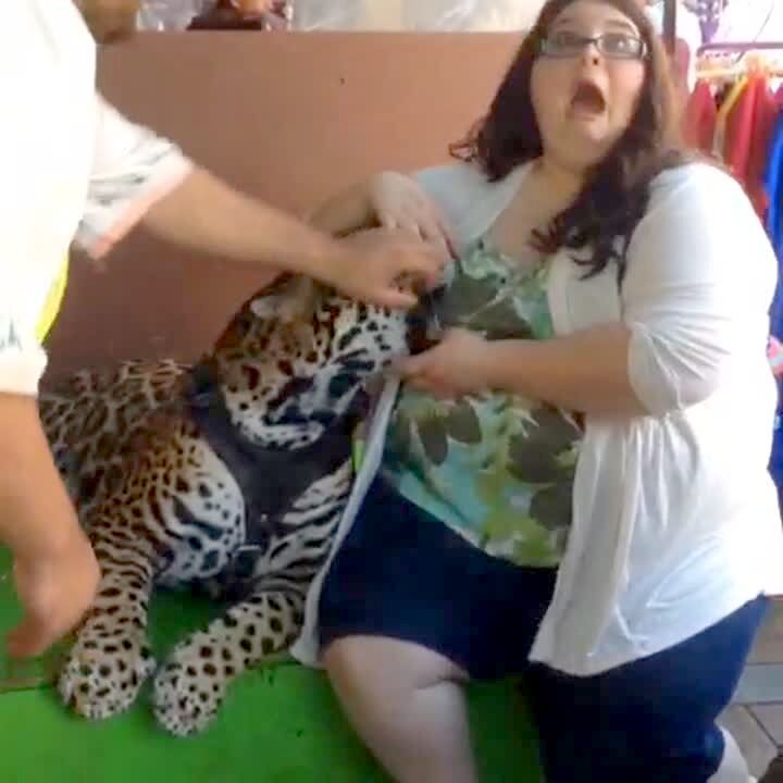 A leopard licks a woman's hand outdoors before she pulls her hand away and the leopard bites at her chest and she screams. Featured talent cleared (the woman who's breast is bitten).
