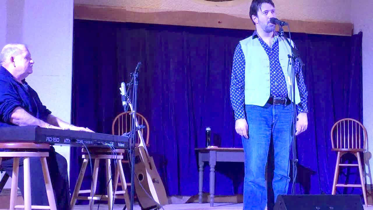 A man sings on stage at a concert. He receives a phone call in the middle of his performance and answers the phone and carries on a conversation as he continues to follow along with the song.