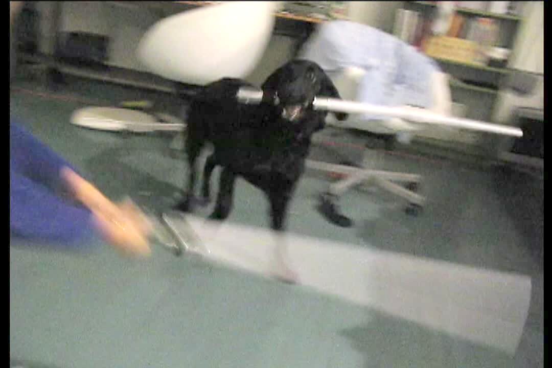 Boy kicks a soccer ball through a net while man stands in front as goalie. Ball hits tot girl in the head behind the net & she falls down. Short tails.