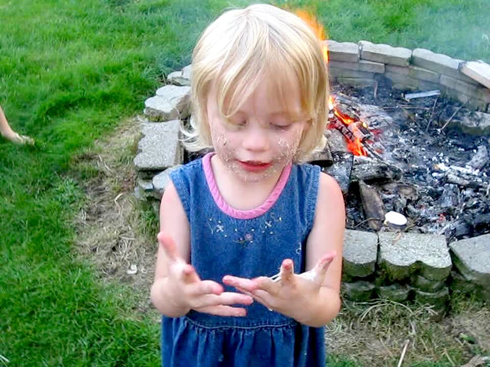Little girl has marshmallow goo all over her hands while making s'mores at a campfire. She puts her hands on her cheeks and they get stuck there. Sticky.