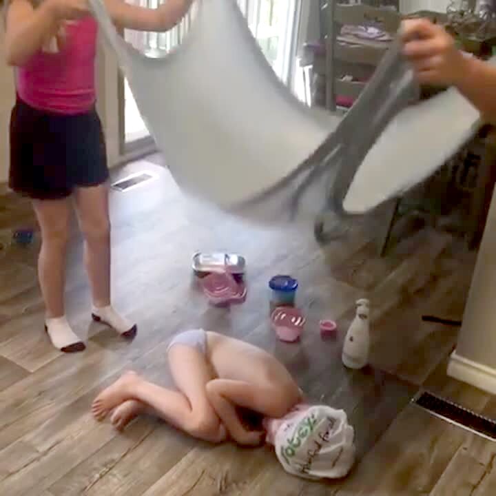 Two young girl pull a large amount of slime and spread it thin. They drop it over their younger sister and it makes a large slime bubble over her.