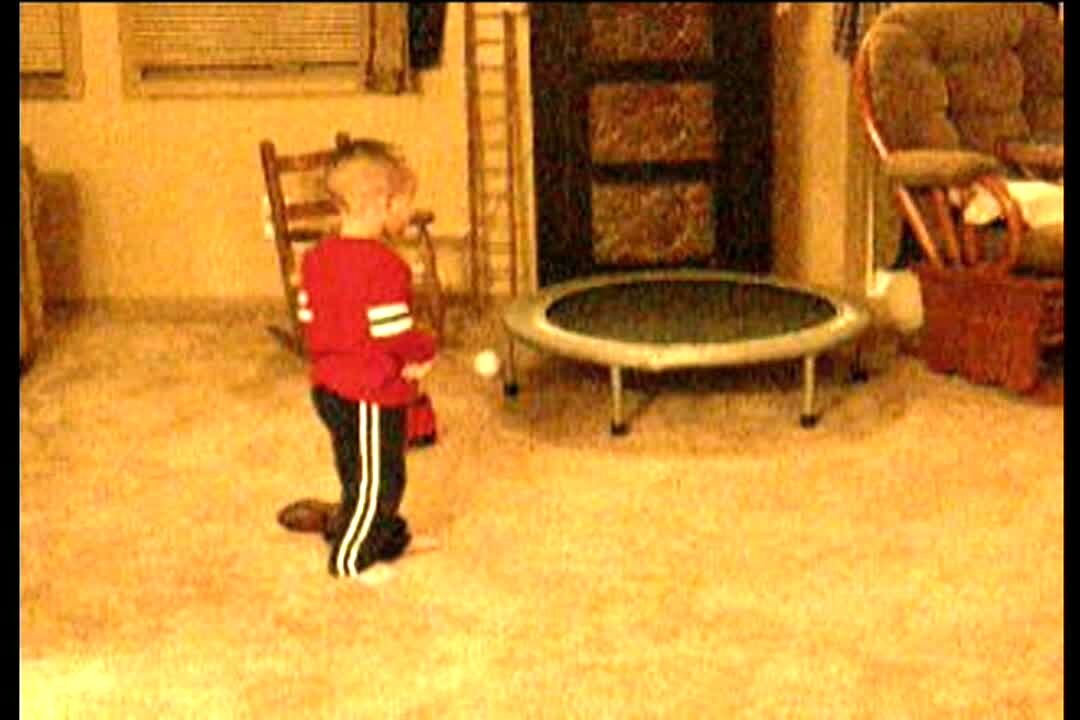 A woman aks 'Where's Jonah' in a living room. A tot boy, Jonah, jumps up and smiles at the camera each time. The third time he jumps, his head smacks the woman in the face and hurts her. The boy laughs.