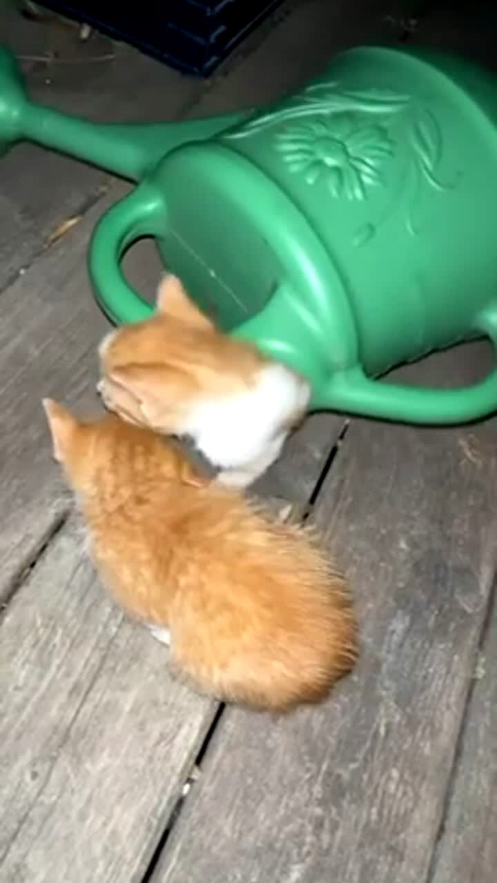 Six orange kitten cats crawl out of a watering can on a patio deck at night.