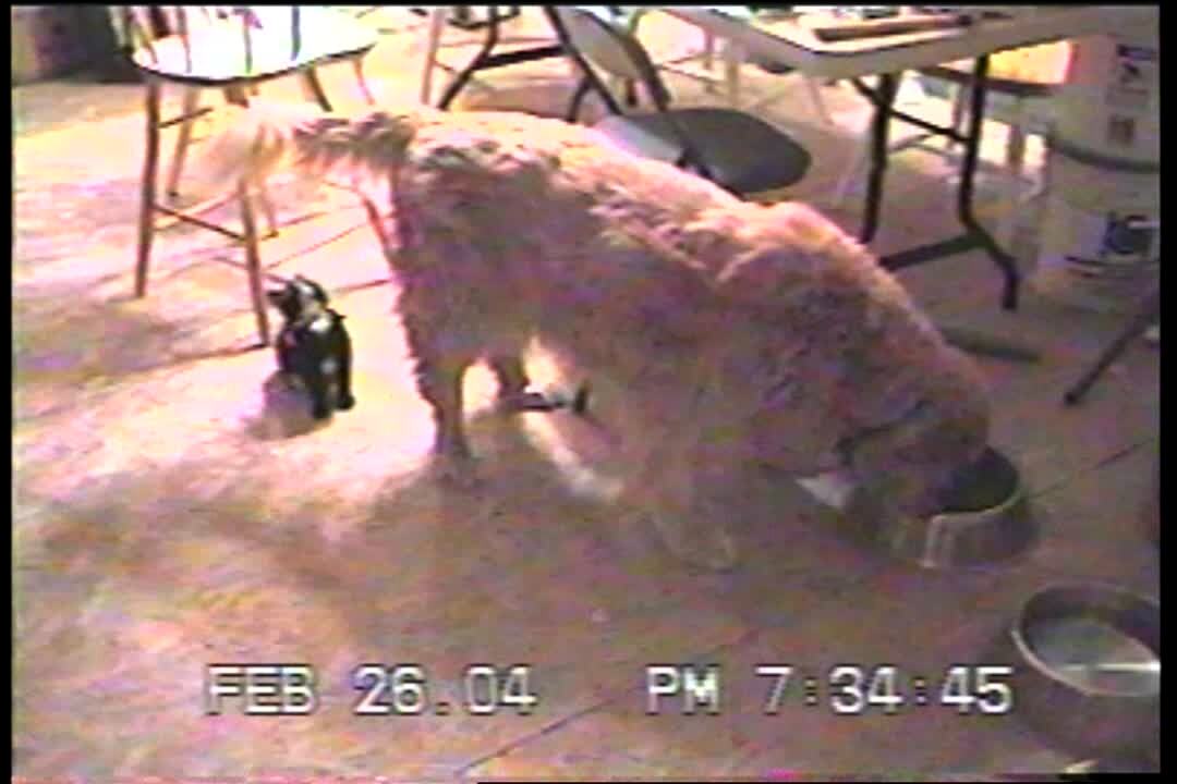 Cat plays with golden retriever dog's tail. Dog looks at the camera funny. Video cuts to cat sleeping on top of dog. Cute.