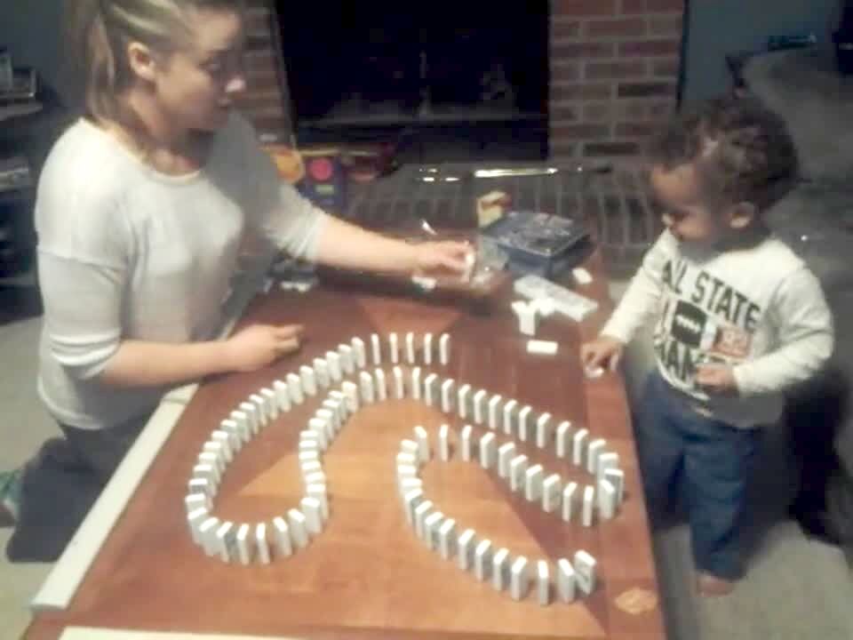 A woman slowly sets up a row of dominoes on a coffee table in a living room. Around 2:20 she tells him to tap over the first domino and he smashes them all over.