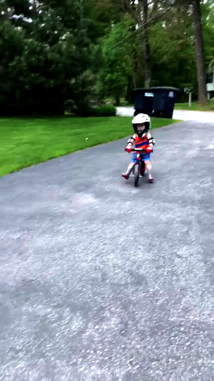 A tot boy rides a Strider bicycle down a driveway and crashes into a garage door and falls down.