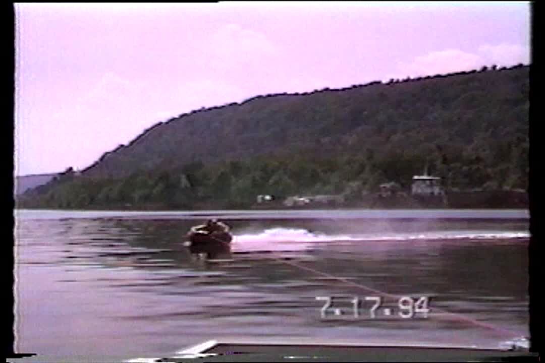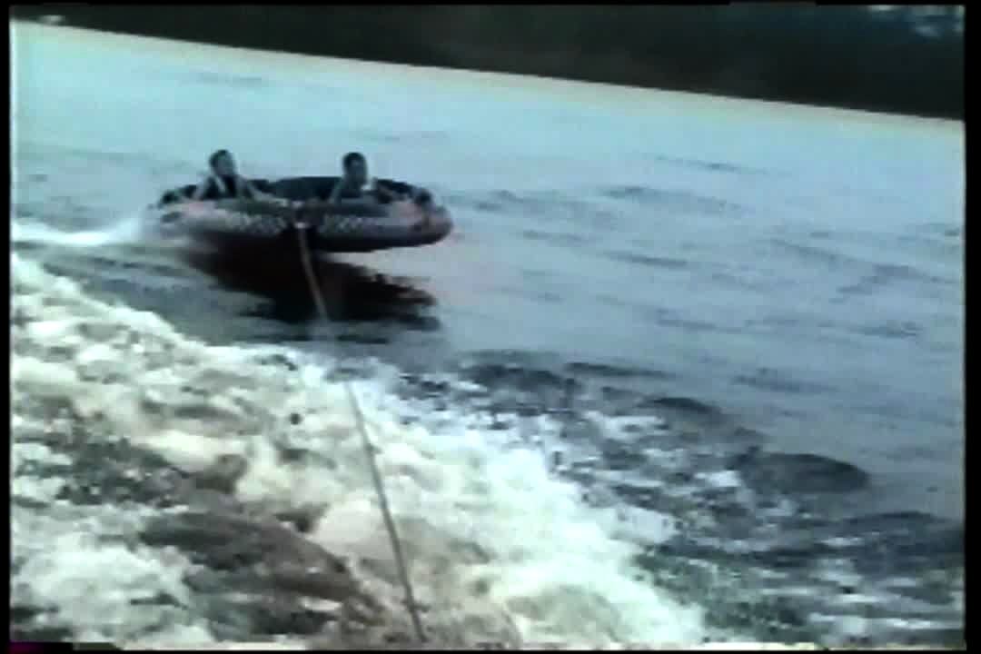 Tot boys on giant inner tube being pulled by motor boat. Tube hits a wave and one of the boys goes flying out, 10 feet in the air.