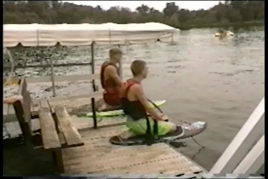 Man shoves off boat / canoe causing it to tip over with other man in it. Lake. DATE ON SCREEN 1993.