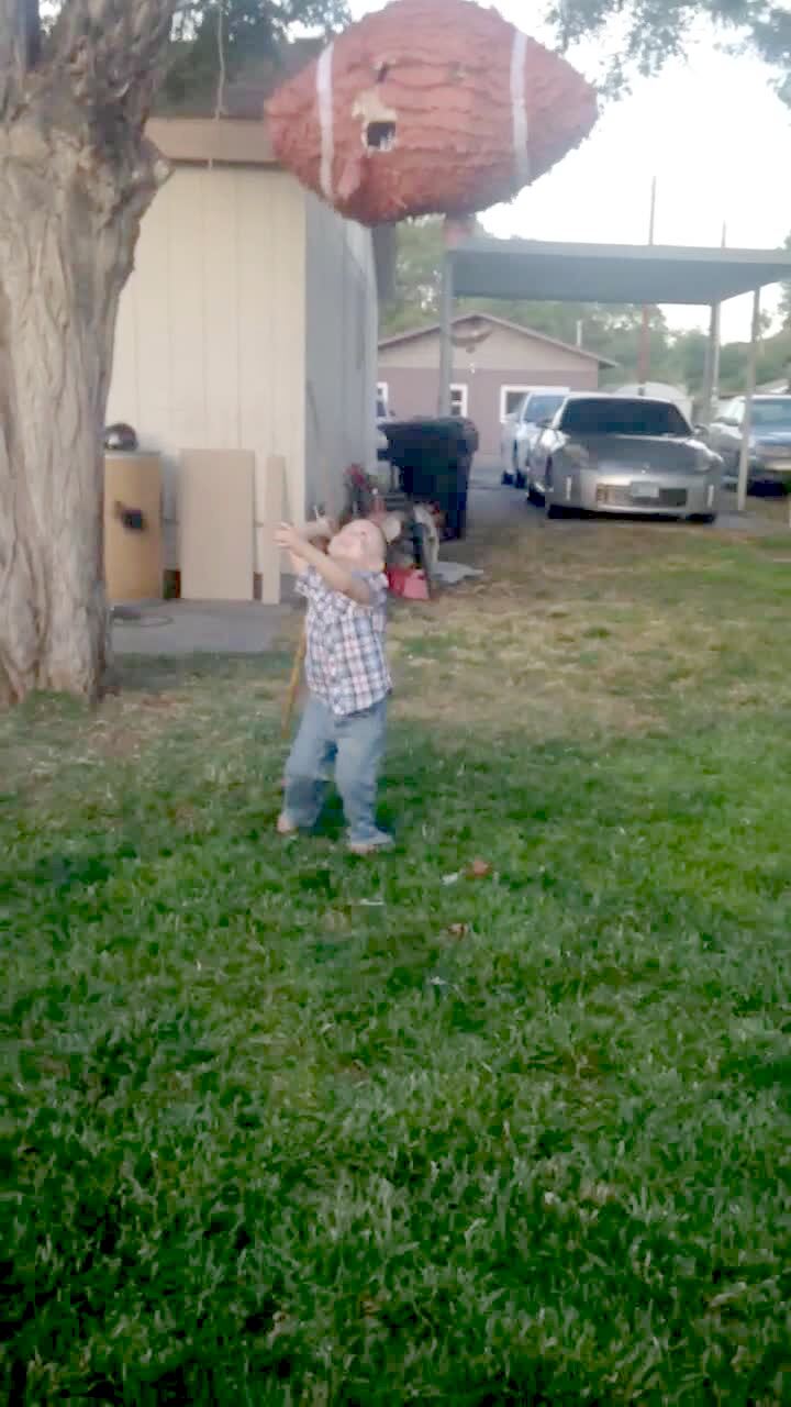 A tot boy bats at a pinata outdoors repeatedly until the pinata rope breaks and the pinata falls on the boy.
