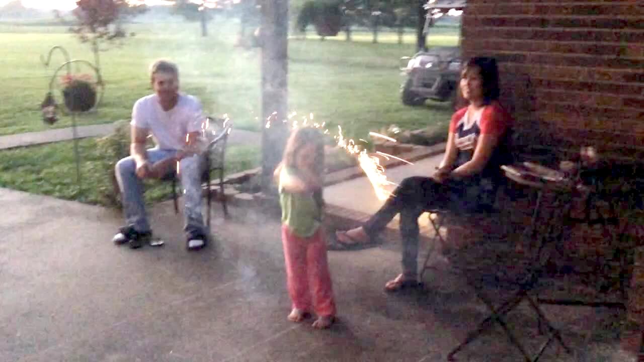 A tot girl holds on to a sparkler outdoors and waves it around. She accidentally lets it go and it lands in her father's lap.