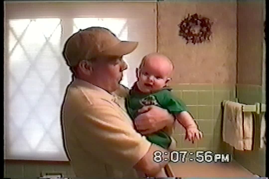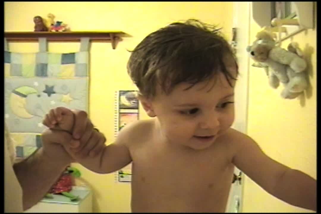 Dad holds 5 month old baby boy in bathroom. Woman off camera knocks on door, baby has great giggle every time. Dad laughs too.
