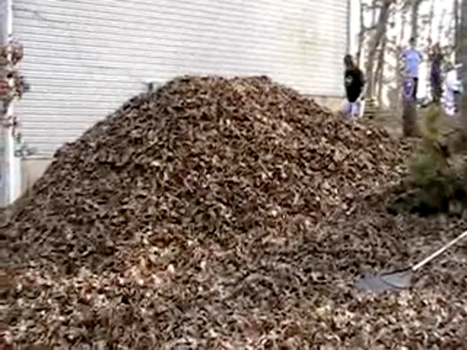 Man tosses tot girl into large leaf pile & she disappears into the leaves. Only girl's face sticks out & she says "cheese!"