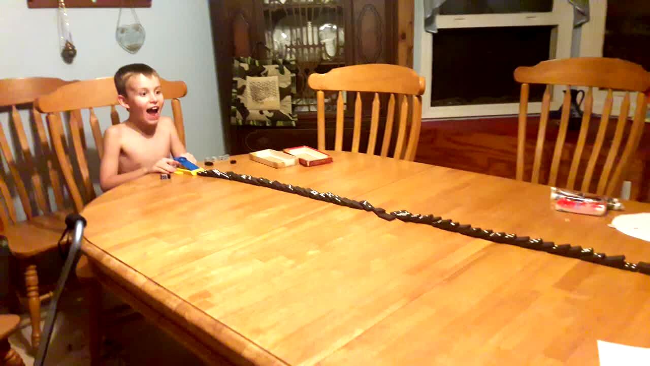 A young boy launches small Lego pieces at a row of dominoes. One of the pieces hits the middle of the line and the dominoes fall in opposite directions.