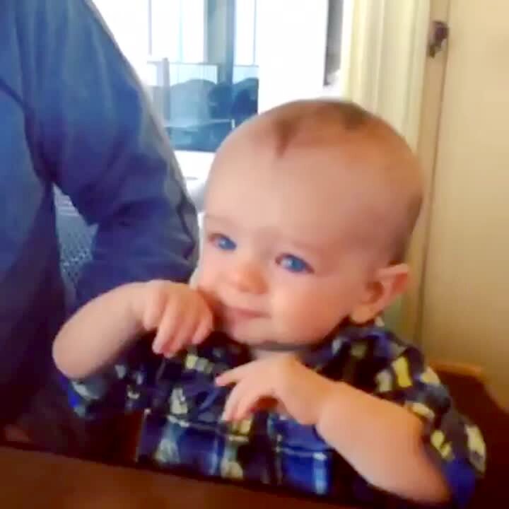 A baby boy tastes a lemon for the first time and shakes in his chair as he makes a sour face.