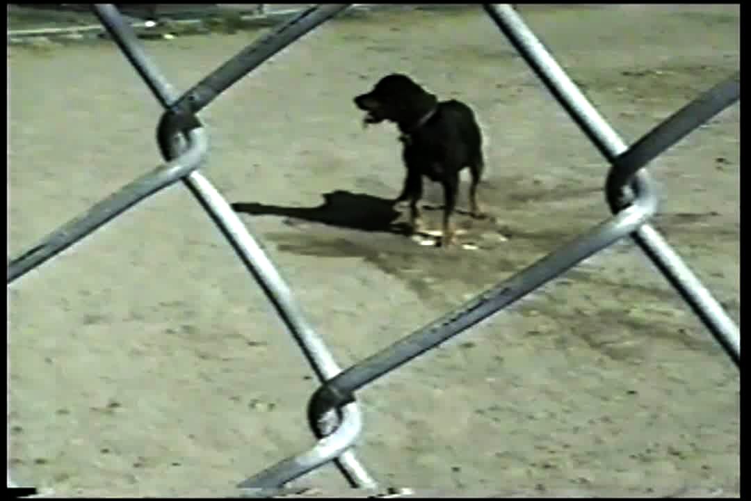 Rottweiler dog digs up home plate on baseball diamond and walks away with it.