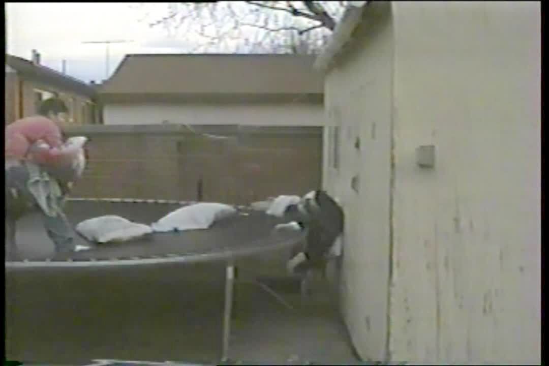 Boy jumping on trampoline, jumps off thinking he will be caught by man but lands flat on his face.