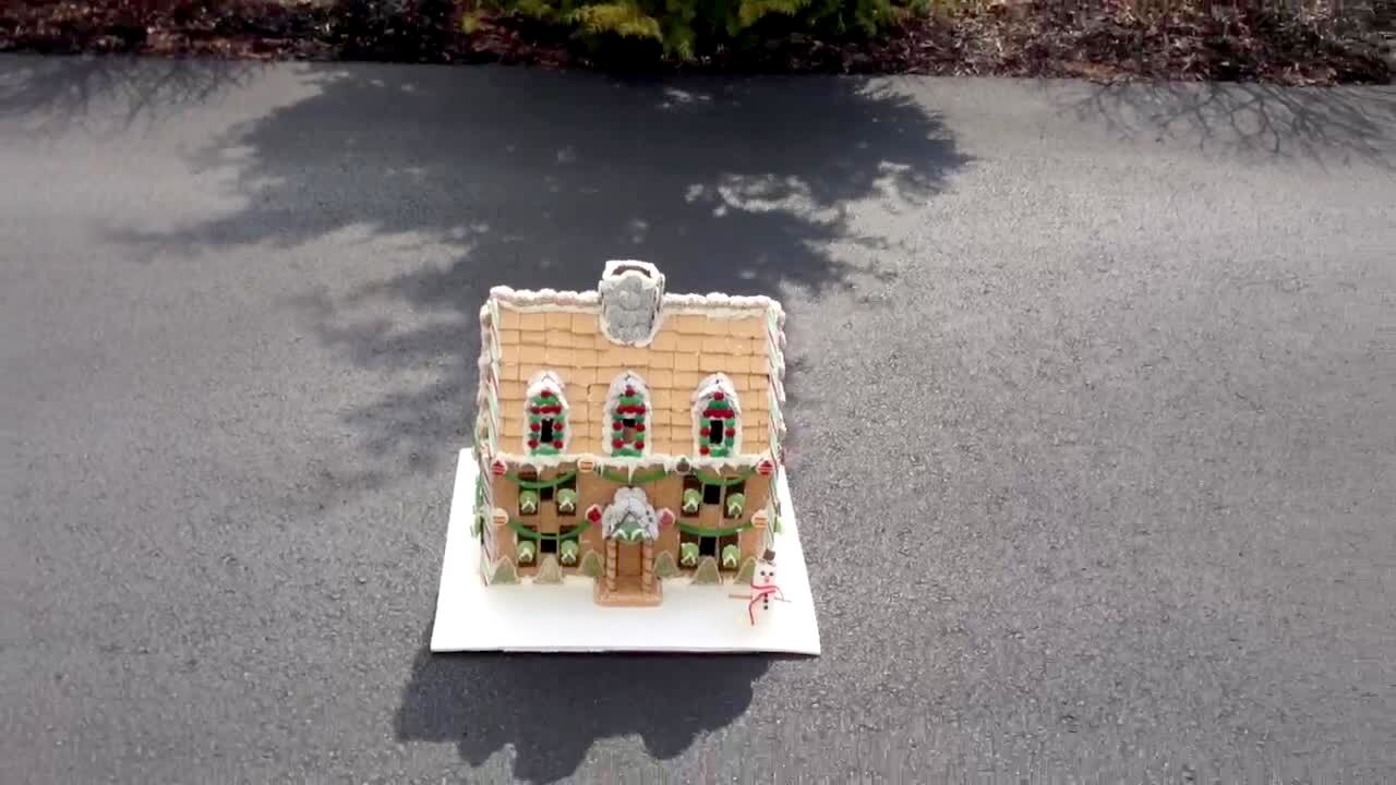 A boy throws a ball over a three story house and into a basket ball hoop outdoors. The boy standing by the hoop yells with excitement.