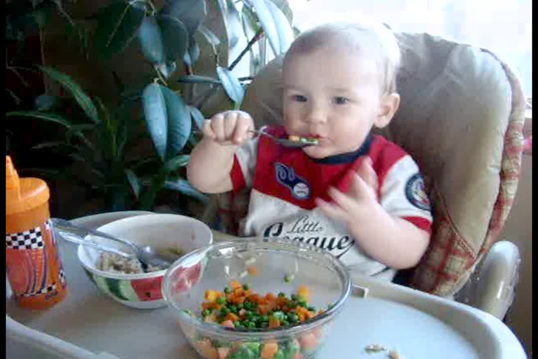 Baby boy eats peas and carrots in high chair. The tray falls off and he looks surprised.
