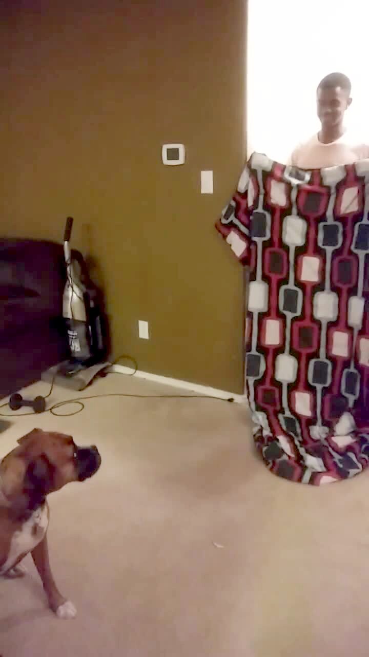 A young boy throws a toy for a dog and the dog runs for the toy and the boy hides under a blanket. The dog runs around the room and looks for the boy, confused. Disappearing Human Trick