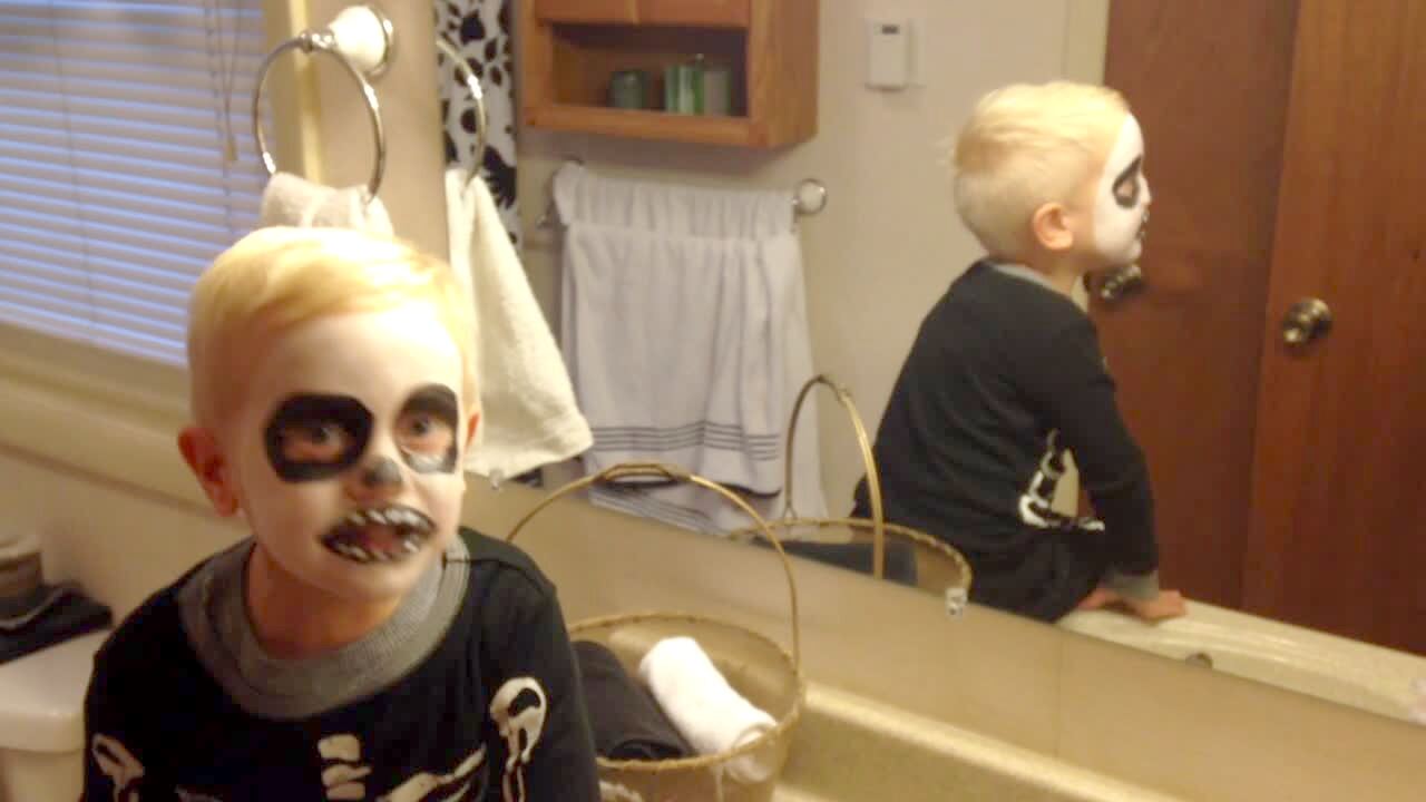 A tot boy with Halloween skeleton make-up painted on his face turns to see the make up in the bathroom mirror and frowns before he cries to the camera that he doesn't like it.