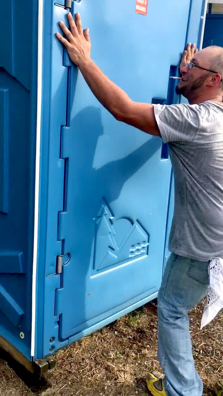 Two men rock a port-a-potty back and forth as a woman sits inside it and yells at them to stop.
