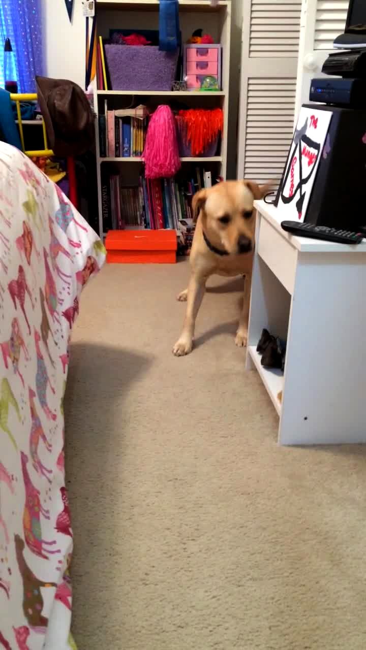 A woman lays face-down on the floor in a bedroom. At :26, a Boxer dog enters the room and whines. It repeatedly walks in and out of the room, then it sniffs her and scratches her face with its paw. She gets up suddenly and laughs.
