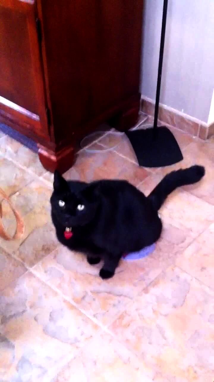A black cat pees in a dog's food bowl indoors while a woman asks him why.