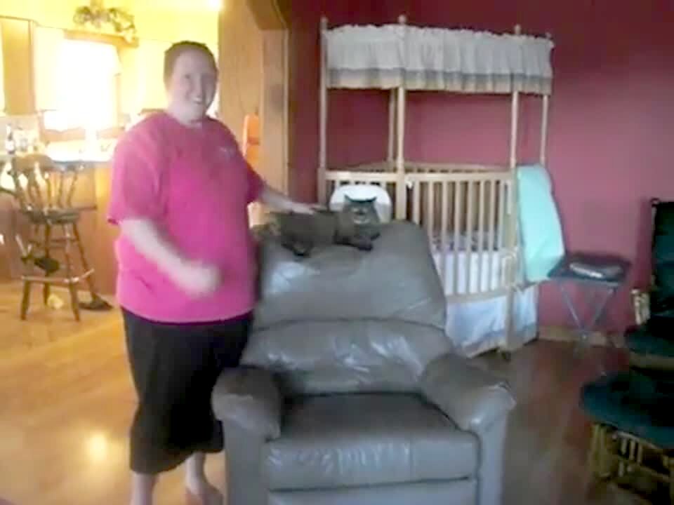 A cat is rocketed off leather rocking chair when a woman sits in the chair and launches the cat off.