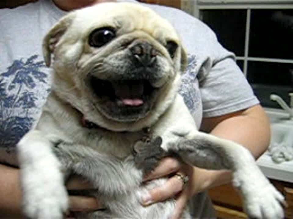 Pug dog growls in woman's arms because he does not want a bath.