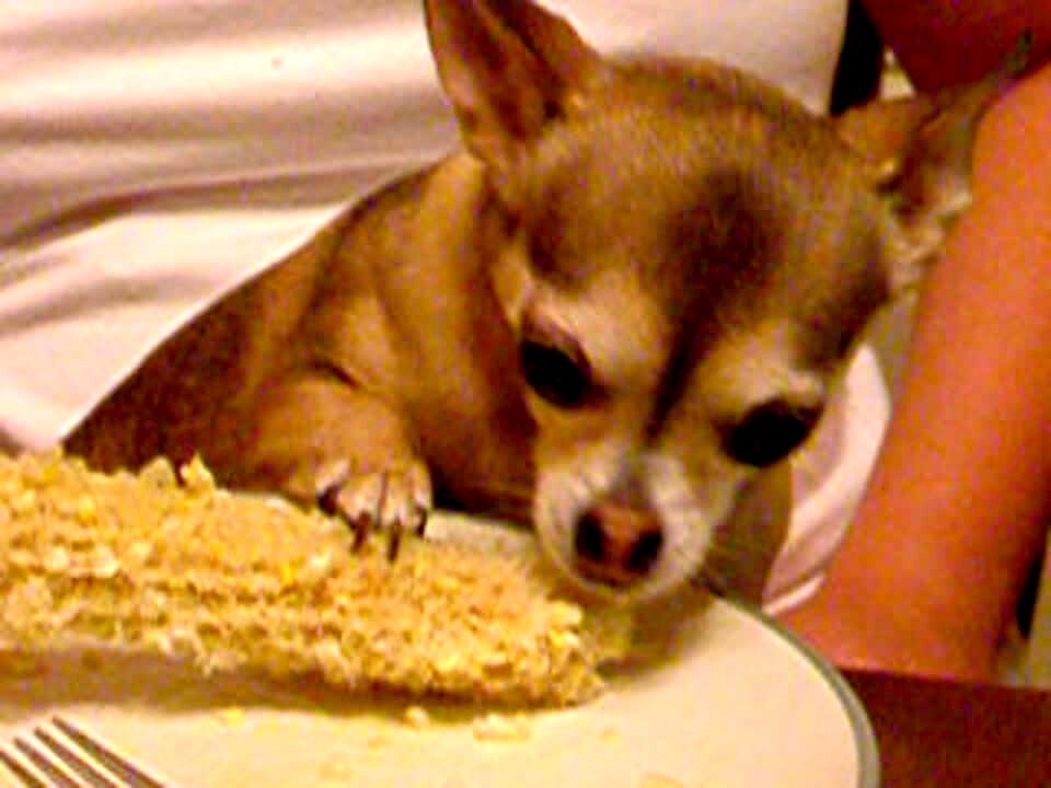 Chihuahua dog eats corn on the cob at dining table while woman holds her. Dog growls when man tries to touch it.
