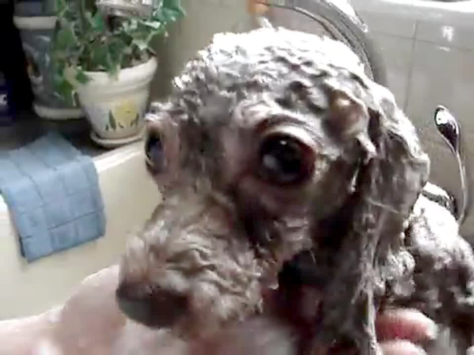 Small poodle dog growls while getting a bath in the kitchen sink. Dog looks angry & a little freaky, bares its teeth.