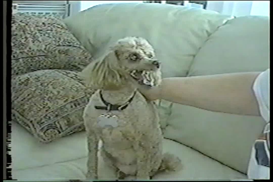 Dog growls and bares his teeth when man asks if he wants a bath, then tries to bite man's finger a few times. Angry, mad.