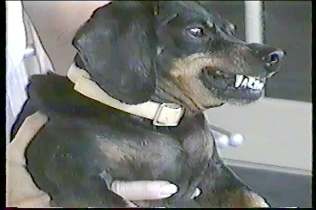 Dachshund dog "loves" its mama, licks her face. When the dog is held out to "Aunt Pam" it gets angry, barks & bares teeth, looks ready to attack, switches back to licking as soon as it's back to mama.