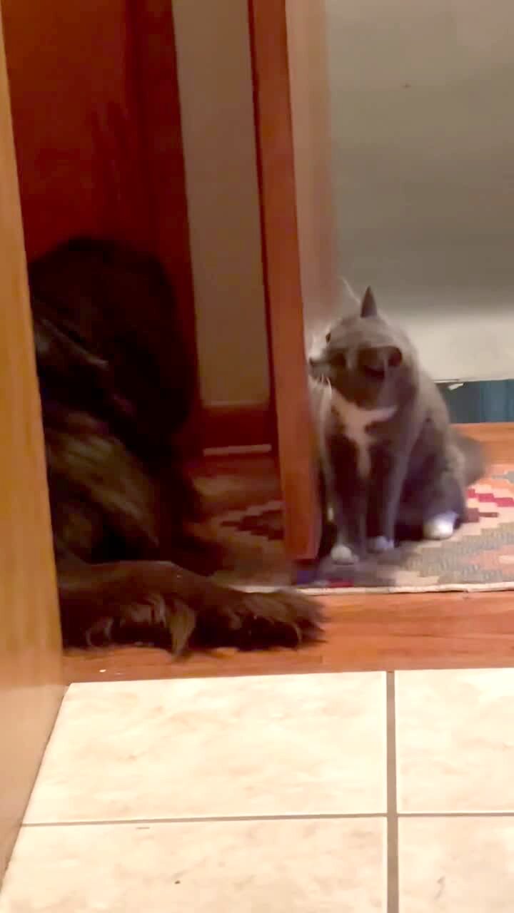 A cat swats at a dog from underneath a door, then the dog pushes the door closed.