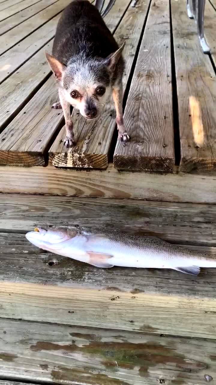 A Chihuahua dog guarding a fish on the porch growls at a woman every time she approaches him.