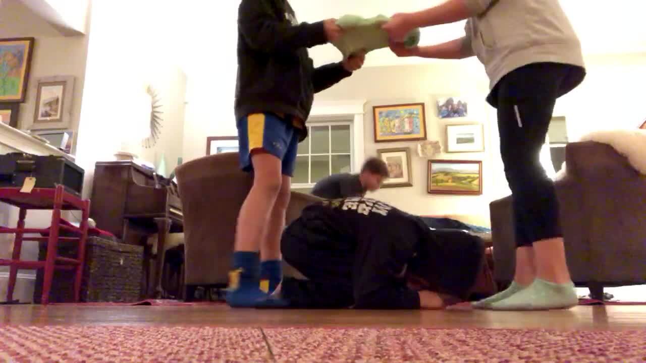 "Beanbag Blowout" - A woman films the aftermath of her two sons playing with the insides of a bean bag chair. The two boys blame their tot brother for making the mess and say they will clean it up. Styrofoam balls are everywhere.