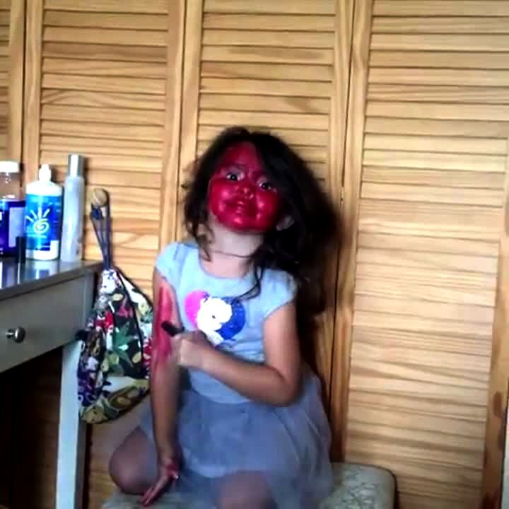A tube of blue food dye explodes on a young girl when she squeezes it too hard as she tries to color a blob of slime on the dinner table. Assignment America: Slime. Action starts at 1:20.