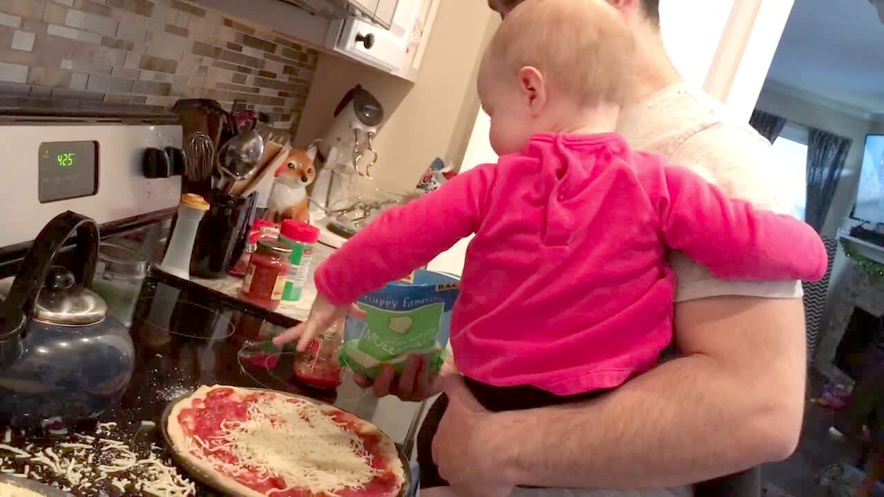 A tot girl helps a man put cheese on an uncooked pizza in the kitchen, but she misses and throws it on the counter instead.