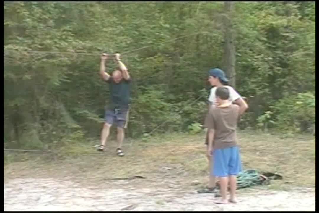 Man tries to walk across tight rope while camping. His feet slip off the wire & it hits man in the crotch. He tries again & gets hit in the groin again. Bonehead.