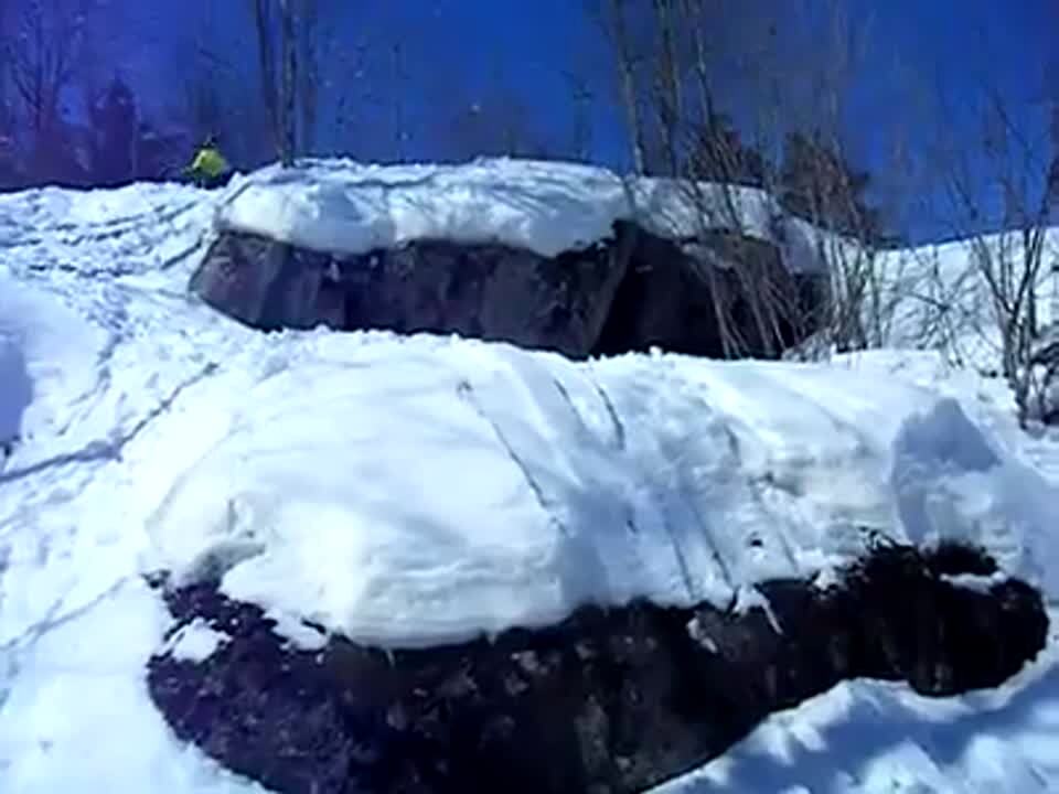A teen boy skis off a jump, lands on another jump, lands unevenly and crashes into a tree with his butt.