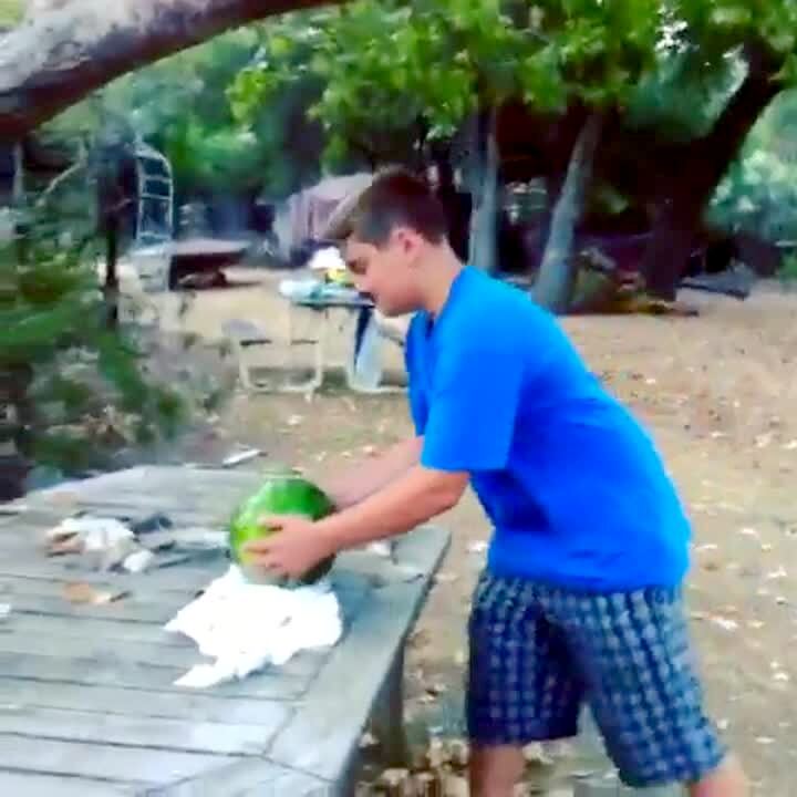A boy puts a watermelon on a table outdoors, and attempts to break it with his head, but the table breaks instead.
