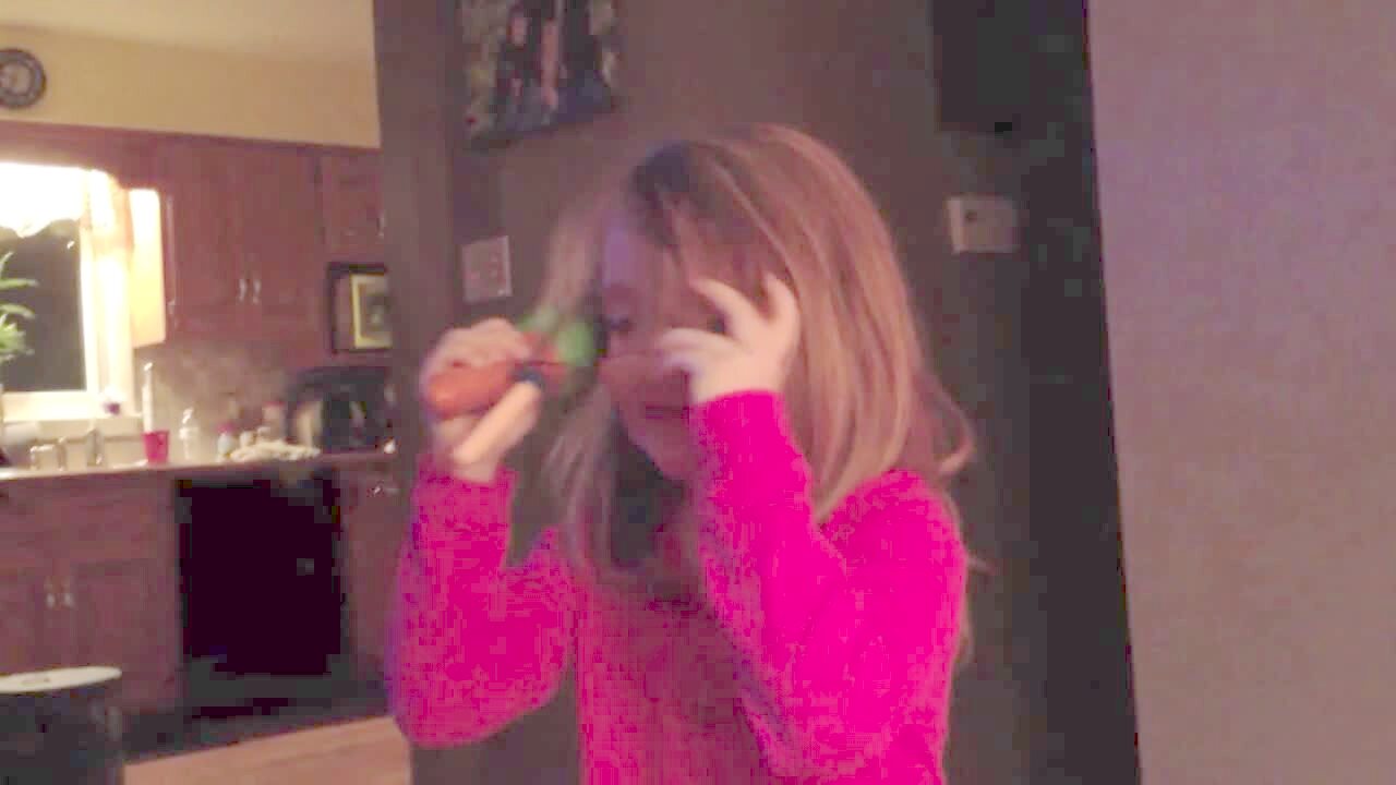 A girl sings in the living room and is hit in the glasses with a Nerf dart Action at :47