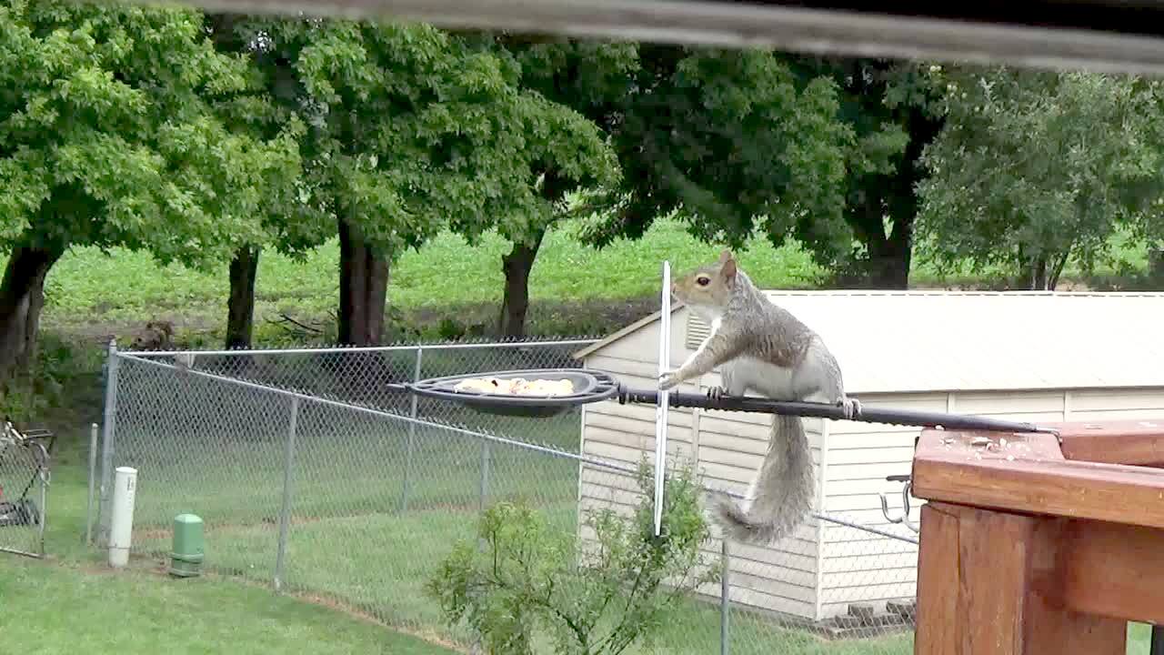 A squirrel hangs and swings from a bird feeder outdoors and when the squirrel finally lets go, it struggles to walk on the ground because the squirrel is dizzy.