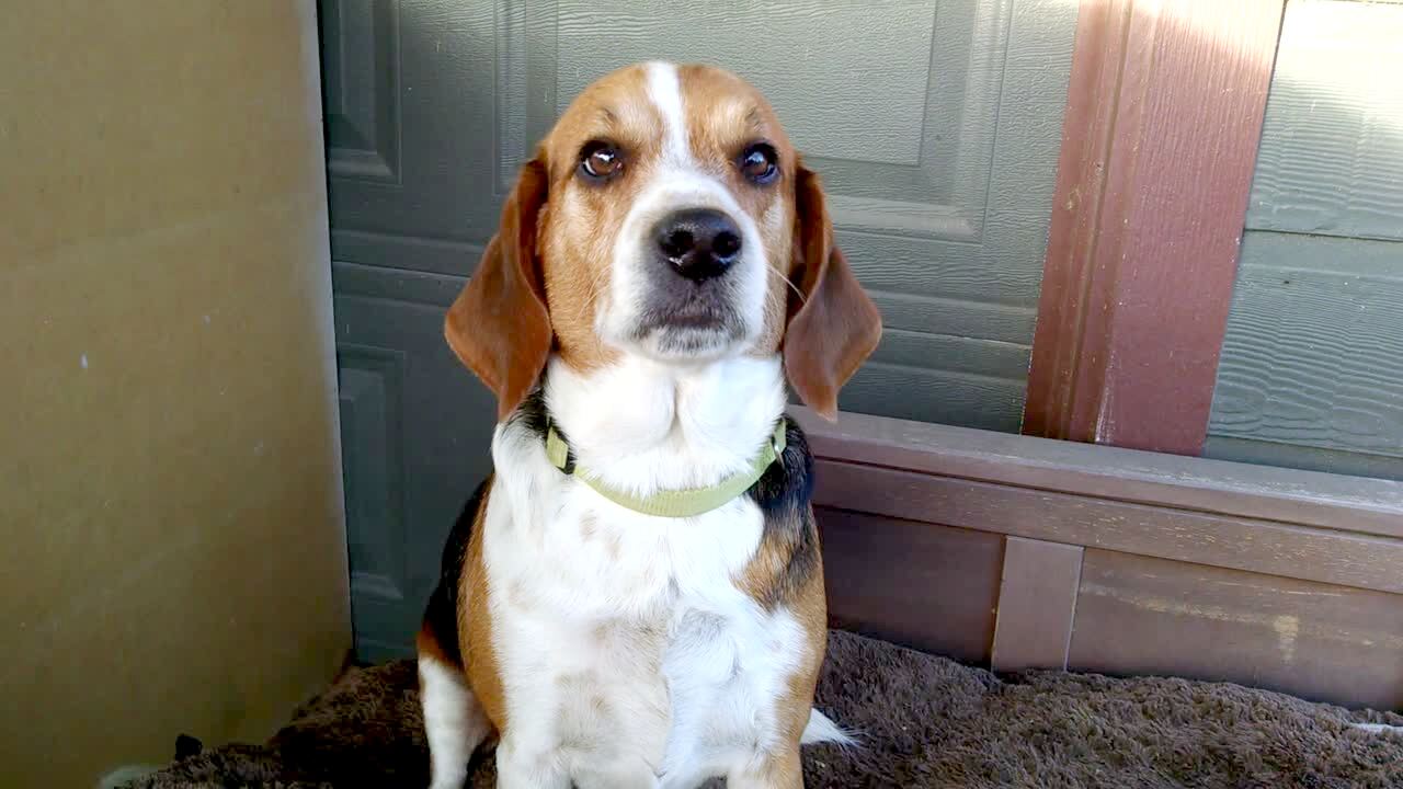 "Bacon Begging Beagle" A dog shakes and whimpers when presented with a large box of bacon.