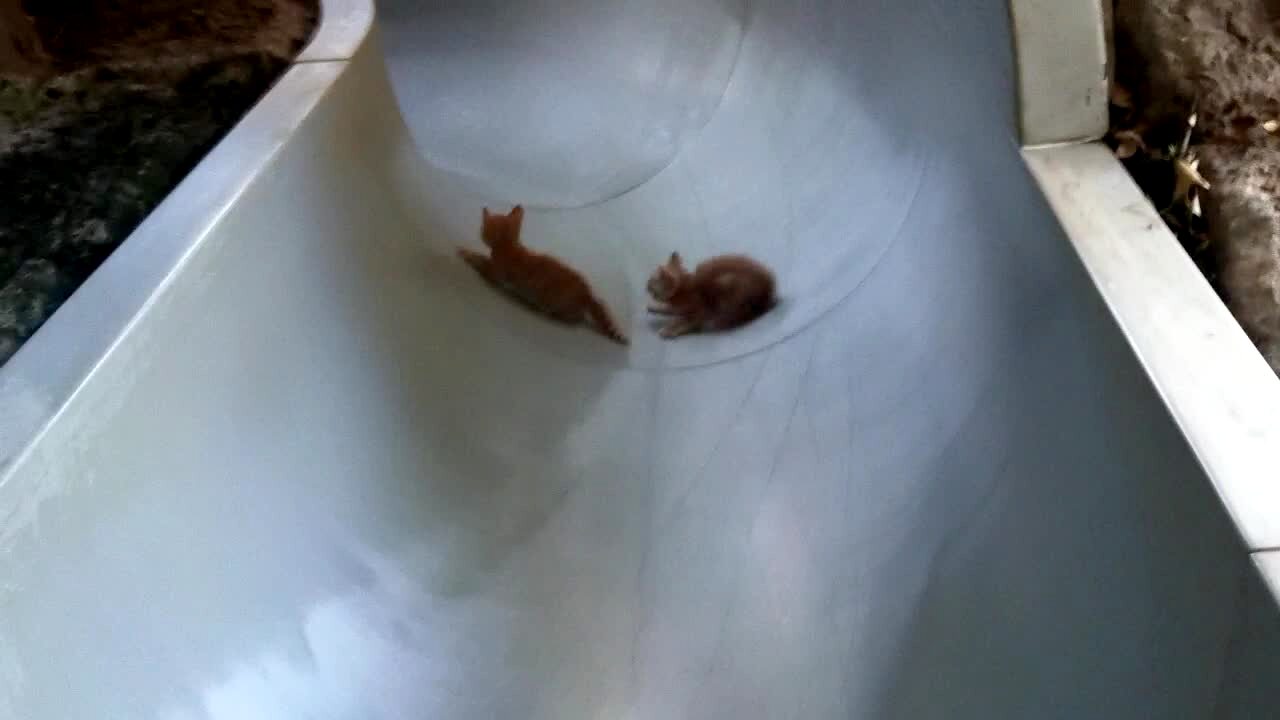 Two young men walk on a powered-off water slide in a pool after two kitten cats have gotten stuck in the slide. The kittens try to jump up the slide but slip back down. A man throws a towel over one of the kittens, while the man behind the camera tosses a box on top of the other as it runs down the slide under the box.